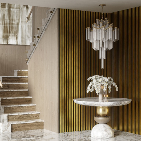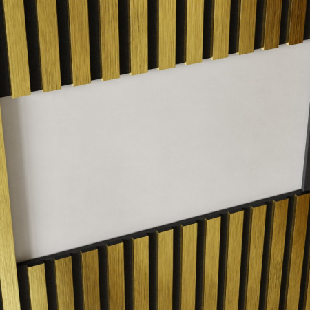 Акустические панели Cosca decor – это уникальный по функционалу декоративно-отделочный материал: - акустический комфорт в помещении без эха и шума снаружи; - современный дизайн; - легкий самостоятельный монтаж даже поверх старых обоев. Основа панелей – акустический войлок 9мм. Изготовлен из экологичного волокна, устойчив к влаге, долговечен, воздухопроницаем, подавляет и преломляет звуковые волны. Коллекция ЭМИРАТЫ Декор панелей – рейки из ЭКОПОЛИМЕРА, облицованные металлизированными пленками методом термопереноса: влагостойкие и ударопрочные. Блестящие полированные поверхности усиливают естественный свет, делая пространство больше и ярче, придавая статус и респектабельность интерьеру. Размер реек 30х10мм, расстояние между рейками 20мм. Широкая цветовая гамма из 8 цветов: хром, хром матовый, желтое золото, золото матовое, красная медь, шампань, черное зеркало. Ширина панелей 300мм. Панели продаются комплектами по 2 шт.