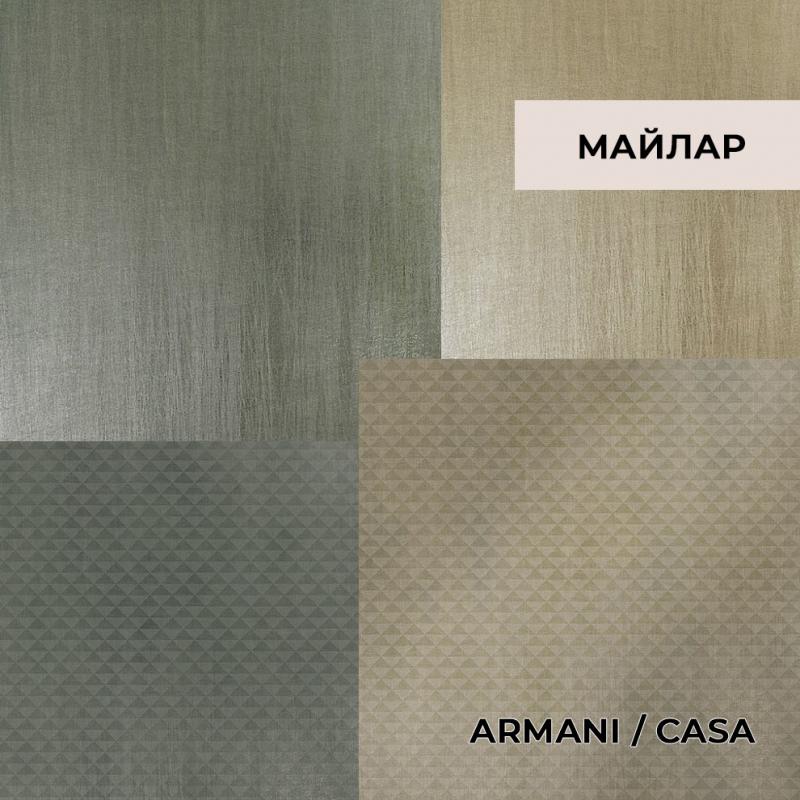 • с покрытием майлар - полиэфирной металлизированной плёнкой, отличающейся высокой прочностью на растяжение. Обои с майларовым покрытием отражают свет, имеют оригинальный дизайн, являются менее мнущимися и жесткими в сравнении с фольгированными обоями. Такие эффектные покрытия вы найдете у Armani / Casa.